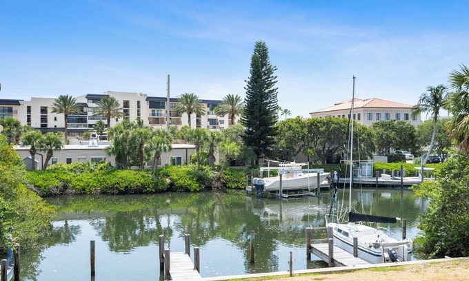 Best value walking distance to the beach! Recently renovated, nicely furnished, spacious townhome in fantastic location! 2 story townhome (bedrooms upstairs) with all the furnishings of home. Great neighborhood location, and one block to the beach and village beach market. Cast your fishing line into the canal at the back of the property, or just watch the fish jump and the manatees swim by. This property offers WiFi, HVAC, washer/dryer, one car garage, and more for a tremendous stay. A great place to call homebase while you're away, we hope you enjoy your stay.
