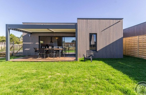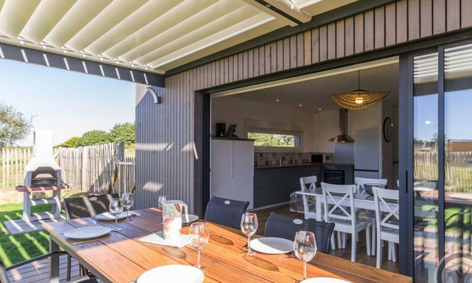 Detached house. Entirely on the ground floor. Entrance. Living room (TV, ADSL internet). Open-plan kitchen (oven, dishwasher, microwave, refrigerator with freezer). Shower room with toilet. Bedroom 1 (1 bed 160X200). Bedroom 2 (1 bed 160X200) and bedroom 3 (2 twin beds 80X200). 2nd separate toilet. Laundry room (washing machine, dryer). Baby equipment on request. Sheets for hire. Cleaning service at an additional cost. Electric heating included. Reversible aerothermal air conditioning. ALL CHARGES INCLUDED. Private enclosed grounds. Terrace with bioclimatic pergola. Garden furniture. Barbecue. Deckchairs. Parking. Well protected at the bottom of a natural haven, the charming village of Portbail is a magnificent setting for your holidays with family or friends. Set back from the wild dunes, this house with contemporary architecture offers all the comforts for a remarkable stay. On one level and bathed in light, it features a large sliding bay window that transforms the terrace into a real extra room when the warmer weather arrives. Located on the edge of a building zone, the property enjoys a peaceful and unspoiled setting. Highly functional and perfectly equipped, you'll find it hard to leave this idyllic vacation spot! Located on the edge of a building zone, the property enjoys a peaceful and unspoiled setting.