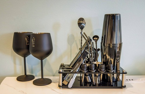 The Gourmet Chef will Enjoy Over the Top Cooking Supplies, Utensils, Pots, Pans, Dishes, Glasses, and an abundance of Counter top Appliances including Toaster, Waffle Maker, Panini Press, Blender, Rice Cooker, Hot Pot, Crock Pot, Indoor Grill, Coffee Maker, Tea Maker and Kettle. Complete set of Barbecue Utensils available for Outdoor Blackstone Grill.