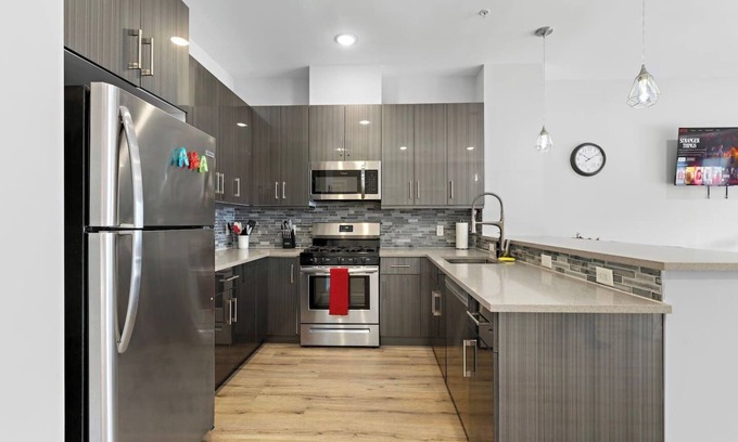 Discover NYC effortlessly! Minutes from Newark (NWK) & JFK airports, our location has a Light Rail station nearby. Enjoy a cozy stay with a memory foam queen bed, pull-out sofa, and a roomy walk-in closet. Stay connected with fast Wi-Fi, a dedicated workspace, and two 4k UHD Roku Smart TVs. The bathroom provides complimentary toiletries, and the fully equipped kitchen ensures convenience. Benefit from a private garage, gym access, and an in-unit washer/dryer for a seamless experience.