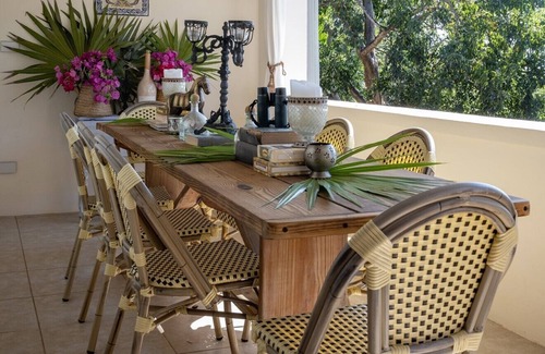A tropical garden surrounds charming Indigo House. Amenities include air conditioning throughout, ceiling fans in every room, washer and dryer, STARLINK super-fast high speed internet, TV, iPod dock, a landline telephone, gas grill, water filtration system, and a bicycle.