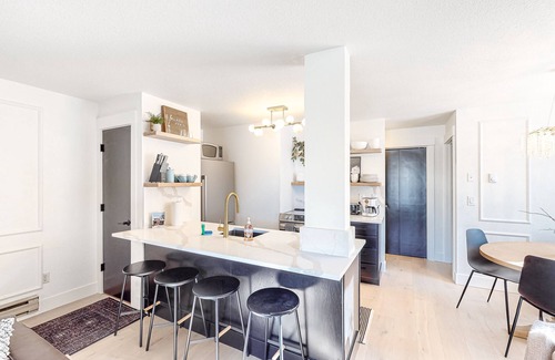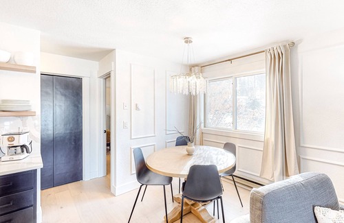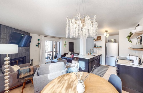 The condo's interior brings an elegant sense of style to the most classic of Idaho settings. As you step inside, you'll be greeted by an abundance of natural light, decorative wall mouldings, and bold, contemporary furnishings. Enjoy a sleek kitchen with stainless steel appliances, ample seating at both the breakfast bar and the dining room table, and a living room with a smart TV mounted to the wood-burning fireplace. A stacked washer/dryer and free WiFi are provided as well.