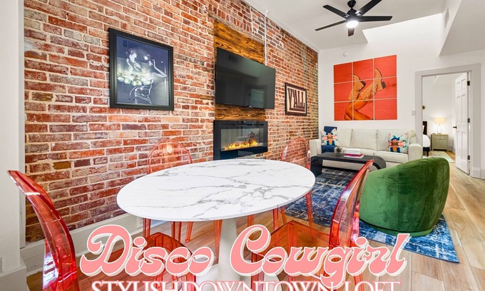 Get ready to step into a world of vibrant charm and bold design at Disco Cowgirl, a stylish 400 sqft loft nestled in the heart of downtown Hot Springs, Arkansas. Perfect for couples or small groups, this cozy space offers a King bed and a Queen size sleeper sofa, blending retro flair with all the modern comforts you need for an unforgettable stay.