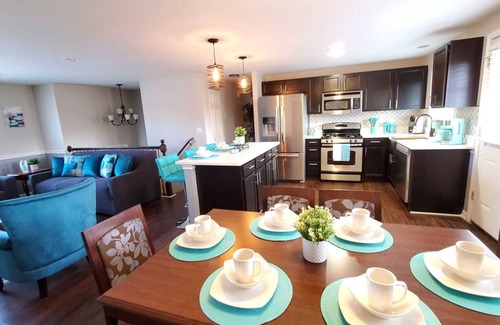 Upper level: Big Living Room with Smart TV, Fireplace to cozy up with Family. Modern Open Eat-in Kitchen with Custom cabinets, Stainless Appliances, White Quartz Countertops, Breakfast Island & dining table. Master Bedroom King bed & TV. Modern Tub Bath with big vanity. 2nd Bedroom-Queen bed &TV