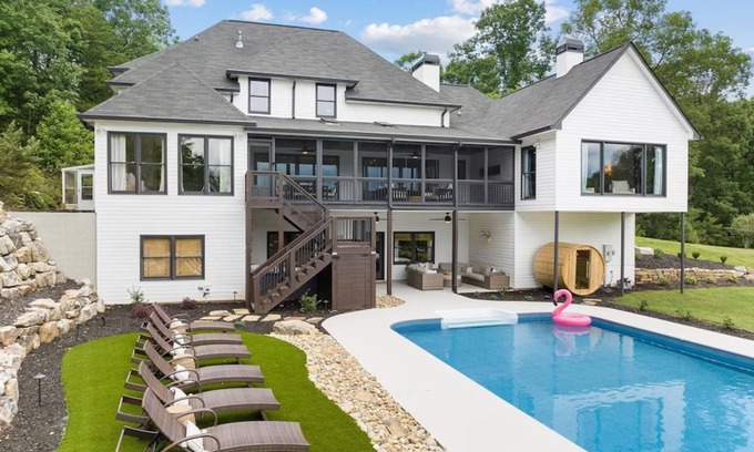 Escape to the mountains and enjoy a phenomenal retreat at this gorgeous estate! You can have it all at this marvelous home boasting a sparkling, private pool, an expansive pool deck with plenty of chaise lounges for everyone in your group, a dry sauna, multiple living spaces, and even a built-in speakeasy with a bar! During your stay, you will also be within easy reach of several great wineries including Frogtown Cellars, Three Sisters Vineyards & Winery, and Kaya Vineyard & Winery as well as the Big Creek Distilling Co all just south in Dahlonega.