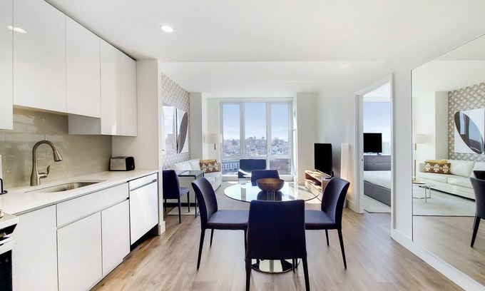 Live in luxury in this one-bedroom apartment featuring floor-to-ceiling windows, high ceilings, large closets and an in-unit washer/dryer. All beds provided are fitted with plush linens and pillow. All Furnished Quarters apartments include 24/7 guest service. Pets are allowed in select apartments and are subject to a $500 non-refundable pet sanitation fee for one pet, $750 for two pets. Additional charges and size/breed restrictions may apply and vary by building. All pets must be approved by Furnished Quarters. Please let us know ahead of booking if you plan on traveling with a pet. Note, a background check is required per building regulations prior to check-in.