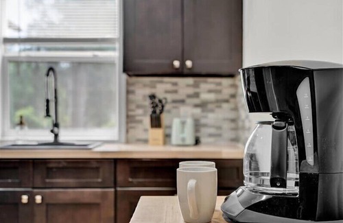 Have a relaxing stay in this charming cabin themed unit with modern amenities and tasteful décor, perfect for a Summer homebase or to nestle up in on a snowy day as you watch the flakes fall gentle onto the pine trees around you.
