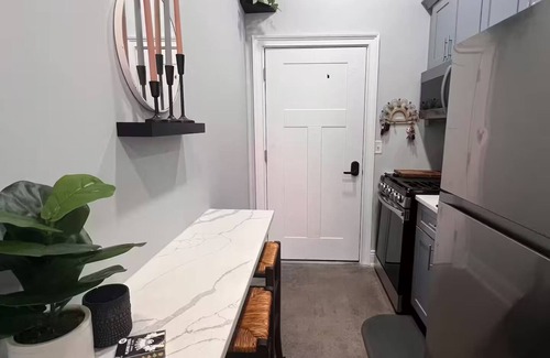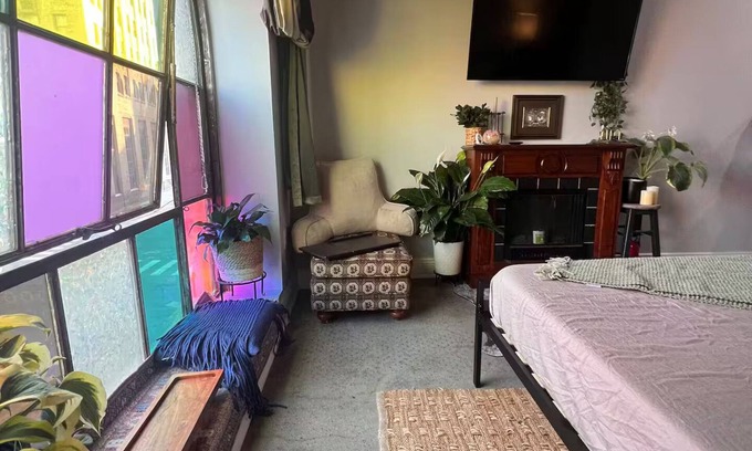 Conveniently located Downtown Bridgeport. Feel free to light a fire. Unique hand tinted windows provides the space with an open feel although it is a small space. Queen size bed, fireplace, and aesthetics sets this apartment apart from any rental you can find. *pet fee for pets. Please let me know in advance.