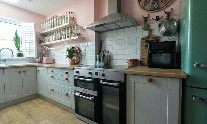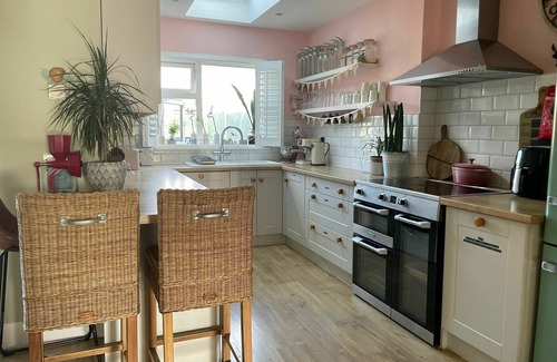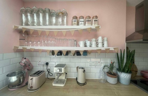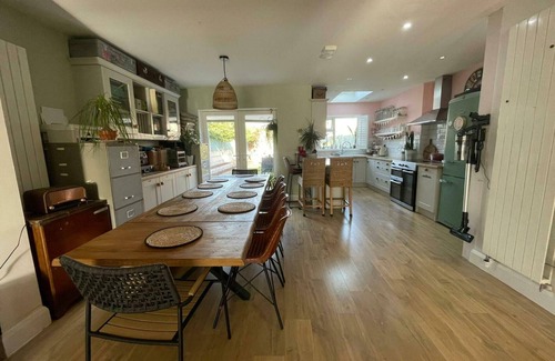 Step into this beautiful and spacious home through a large, welcoming hallway with a staircase and direct access to the open-plan ground floor. The heart of the house features a fully equipped kitchen with everything you need, a stunning wooden dining table with seating for eight, and a cosy, quirky living area filled with charm, character, artistic touches, and plenty of houseplants.