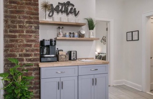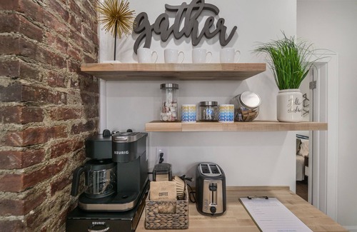 On the second floor, you will find two additional bedrooms, both with cozy queen beds and ample clothing storage space. There is also a second full bathroom with additional toiletries and essentials. The living room is cozy and modern, and features an HDTV, comfortable seating, and lots of natural light! There is a separate dining room with a dining table for four people that can also be used as a dedicated workspace. Similar to the downstairs kitchen, the upper-level kitchen is fully equipped for cooking and baking, and has its own coffee bar with complimentary coffee, tea, and sugar.