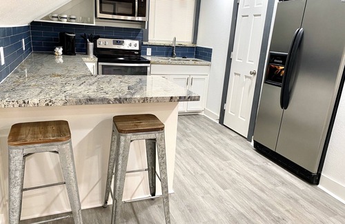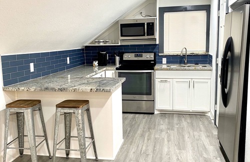 🍳 While it’s a small space you won’t feel like you’re lacking anything. You’ll have access to a spacious fully-stocked kitchen with stainless steel appliances, a beautiful blue backsplash, and granite countertops.