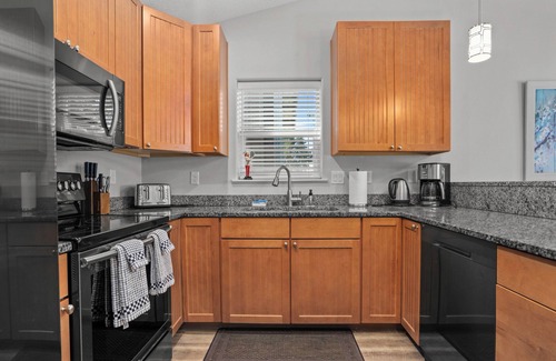 Spread out and relax in this bright, comfy home! Upstairs you'll find a king suite, twin room, full-equipped kitchen, and light, airy living space. Downstairs, enjoy a private bedroom, bath, kitchenette, and its own lounge. Big TV's everywhere, washer/dryer, and a 2-car garage. Out back, a small groomed lawn gives way to a tree-lined wild grassy area with a seasonal creek-perfect for peaceful mornings or sunset unwinding.