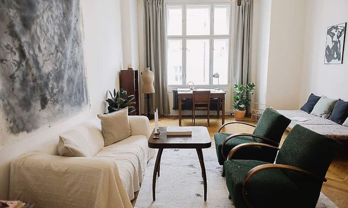 Decorated with antique furniture, books, and unique artwork, this flat offers a cozy, artistic ambiance perfect for both short and longer stays.