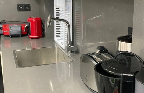 Fully equipped kitchen with all essentials, including a latest-model barbecue and pour-over coffee maker.