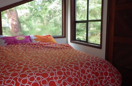 There are essentially two bedrooms, the master is conventionally configured with a queen bed, but the second bedroom has a sliding wooden wall, a full size futon on the first floor, and a sleeping loft with a full size bed, and adjacent rooftop atrium. Then there is what we call the 'Kid Ship'... This is a loft space built above the kitchen, with a full size futon- a huge favorite of our kids, and any adult willing to climb a ladder. It isn't suitable for kids under 7. My bedroom of choice is the sunken living room, which has curtains closing it off from the rest of the house, a large stone fireplace, 46' LED TV, 14' ceilings, tons of windows, and a queen size hide-a-bed couch.