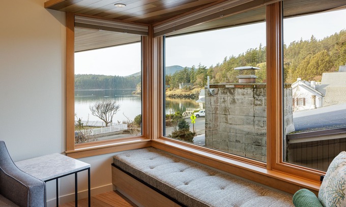 Luxury King Hotel Room plus double sofa bed with partial water view of Eastsound Bay and surrounding Village of Eastsound on Orcas Island, WA