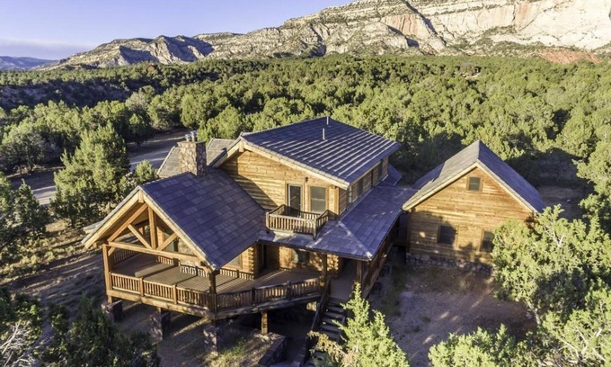 Sugar Knoll Lodge is a large multi-family sized 3 story log built cabin on sprawling one acre property directly adjacent to vacant BLM land for endless hiking and exploring specific highlights include a secret slot canyon and our namesake Sugar Knoll. Sugar Knoll Lodge is located on a hill in front of the majestic White Cliffs of Orderville Utah next to Mt Carmel. It is nestled among the juniper trees in a completely private and secluded setting.