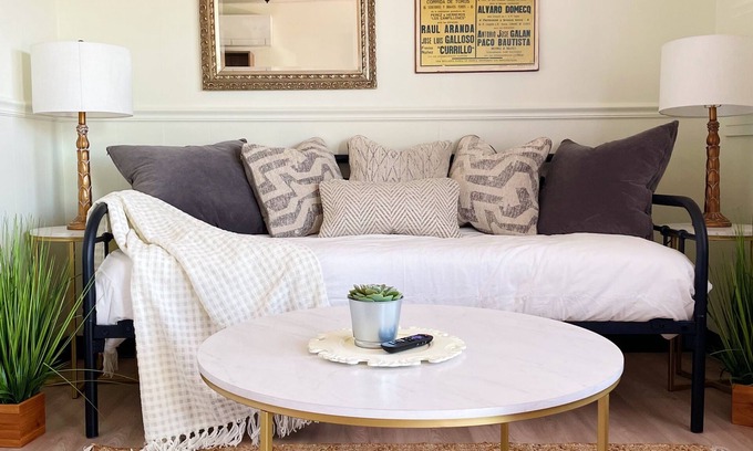 This eclectic and cozy suite features a living area with a flat-screen TV, nap-worthy day bed and picture window that fills the space with natural light. A kitchen features a wet bar, small refrigerator, microwave, sink, and most importantly a coffee maker.