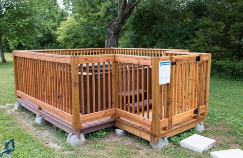 As a traveler, you'll love unwinding in the hot tub after a day of exploring. Stay connected with the high-speed WiFi, and enjoy the convenience of the in-unit kitchen. Curl up by the fireplace and TV for a movie night or dive into the selection of games, books, and toys for the kids. On the 10-acre property are 1.25 miles of manicured paths lined with wildflowers, a 5-person dry sauna that most folks preheat for a treat after a dip in the hot tub, and a kids' playground that is known for its treehouse library. You'll also find custom amenities you can only find in the country like an array of fire pits, tree swings made for kids and adults, and a dog park with runs for off-leash playtime.