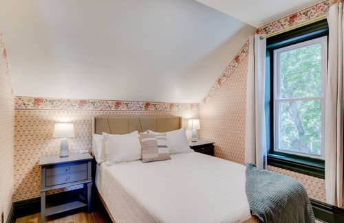 The inn’s first owner, Anna Kearns Johnson, lived in this suite and managed the hotel while her husband worked as a traveling actor. Hand-painted wallpaper and other charming touches may make you feel like you’re staying in a life-size dollhouse. In Annie’s honor, this suite is where we as owners like to stay when we stay overnight.