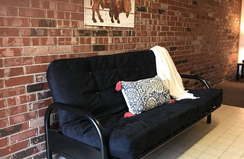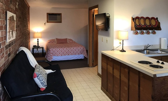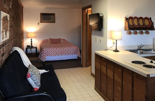 Little Buffalo is a one bedroom studio suite with kitchen, refrigerator, microwave, toaster oven, free WIFI, one queen size bed and a futon. There is a partially fenced off courtyard area with picnic table. It includes a 32 inch flat panel HDTV with DirecTV service, all dishes, linens, bath towels, flatware, pots, pans, kitchen towels, etc. This unit is perfect for a couple but also will accommodate up to 2 additional guests on a futon.