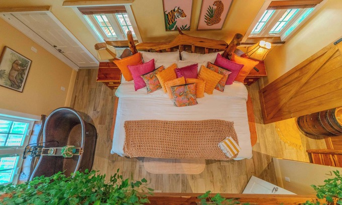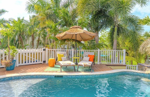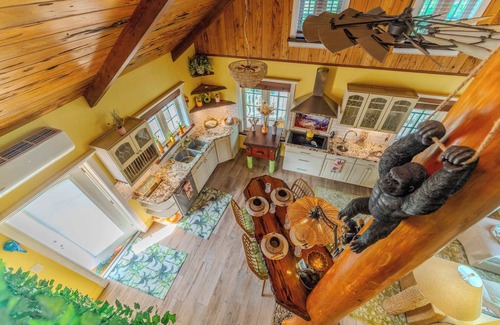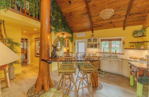 Escape to the Treehouse Suite at Paradise Island Estate, a unique villa in Fort Myers! This 1-bedroom apartment features a master bedroom with an Alaskan king bed, a loft with a sofa bed, and two bathrooms. Enjoy amenities like a private entrance, a jungle-inspired decor, and an outdoor space with a pool, swim-up bar, and outdoor kitchen. Located near beaches, shopping, and the airport, it's the perfect blend of convenience and tranquillity. Guests can also enjoy the game room.