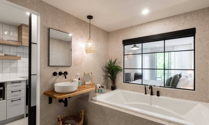 Magnificient Studio completely renovated in January 2023! Large 2-seater whirlpool bathtub, heated floor in bathroom and kitchen, fully equipped for cooking.