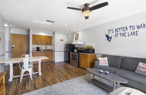 No Wake Zone Suite is the perfect retreat for a romantic escape or a relaxing lakefront adventure! Nestled on the third floor of the Red Bud Cove Barn Suite Lodge, this charming suite offers a peaceful lawn view and easy access to all the excitement of Branson, Missouri -- just minutes away!