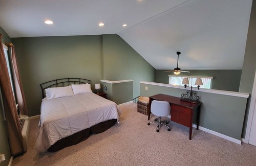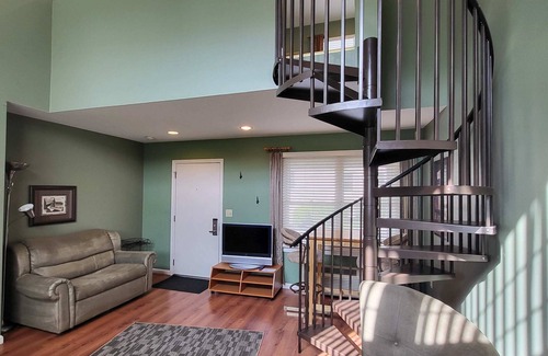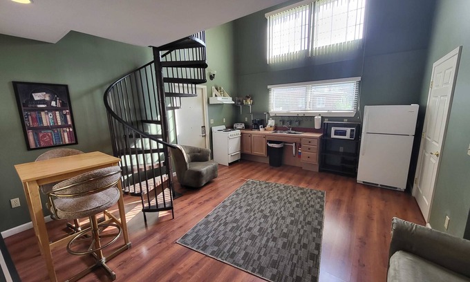 The School is our biggest lofted Suite, with close to 700 square feet of living space, gets it’s Hershey inspiration from the Milton Hershey School. There is a full kitchen, living room with a pull out sofa bed and bathroom on the first floor. A spiral stair case leads up to the lofted second level where sleeping accommodations include a queen size bed, and a set of twin size bunk beds in a separate room with another pull out sofa bed. Also in the lofted level are an in-suite works pace and a walk in closet. This is the perfect Suite for young families or those just looking for a little extra space for themselves or guests. You can even bring the family pet as we do allow some small pets here.