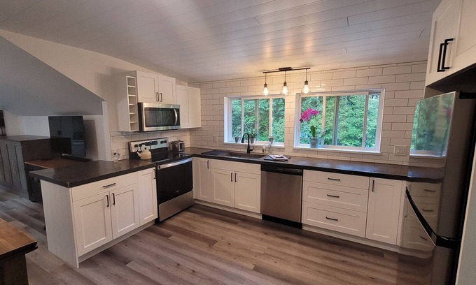 Bright, modern newly renovated guest house with all the amenities you need for a comfortable stay. Our private guest house is located on a rural 5 acre property in a beautiful wooded area. Located just 10 minutes off the highway in a quiet family neighborhood at the end of a cul-de-sac. Forest trails that lead to a creek and waterfall are right at your doorstep.