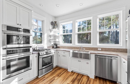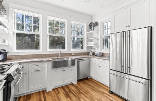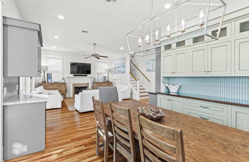 DETAILS: Located in the private, gated community of WaterSound, "Beach Blessings" is a spacious 6-bedroom, 4.5-bathroom home and carriage house that can sleep 14. It's only 500 yards away from unobstructed beach access from Deer Lake State Park, easily accessible by the home's golf cart or bikes. Find a ping pong and pool table in the garage and rinse off in the outdoor shower after a long day at the beach. The open kitchen and living room are the perfect place for everyone to sit back and relax. The chef's kitchen has 2 ovens, stainless steel appliances, and a bar area. The dining table can seat 8 for a meal. The primary bedroom is down the hall and features a king bed and attached bathroom with a shower. There is also a queen bedroom with a shared bathroom.