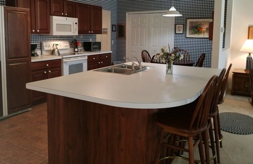 The kitchen overlooks the roomy living room with a large couch and plenty of other comfy chairs to enjoy the 61" flatscreen TV.