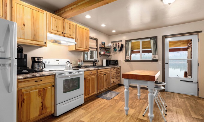 The spacious kitchen has all the equipment needed & a butcher block island with seating for 2 to give space for preparing your meals. Grab your meal & head outside to the picnic table with umbrella or the dining room has seating for 6, with windows all around to give continuous views to the lake & the Cabinet Mountains. When not eating, this is the perfect space for the many board games you'll find!