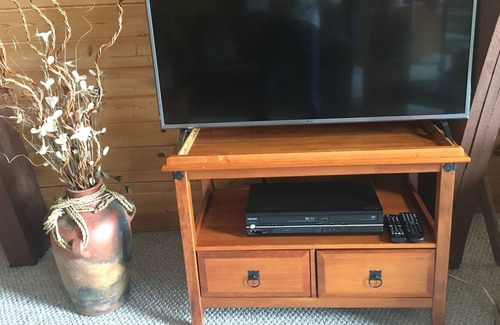 Our inside amenities include 3 bedrooms and a loft for a total of 5 queen size beds (one bedroom has two queens for families). We also have two CD/DVD viewing areas (with new 42 inch TVs) both downstairs and in the loft, comfortable couches and chairs in the open space living room, a full service kitchen, and a large table which can seat everyone. There is a work desk for your computer. Just bring your own laptop and hotspot. There is no wifi in the cabin. Our cabin has one bathroom with a shower. We also provide a portapotty nearby.
