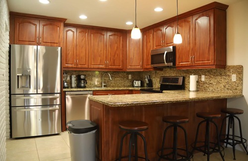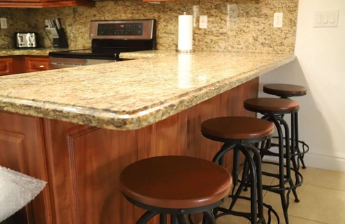 Kitchen counter will accommodate seating for 4 guests on wooden bar stools.