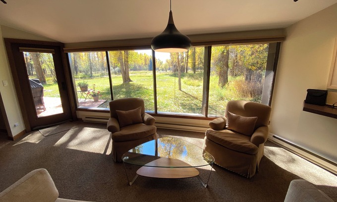 For our "homebody" guests, take in the views both north (of the Tetons from the living and dining room) and south of our private spring-fed stream from the kitchen and family room. Many a guest has been surprised by moose and elk casually strolling past the window while drinking their morning coffee.