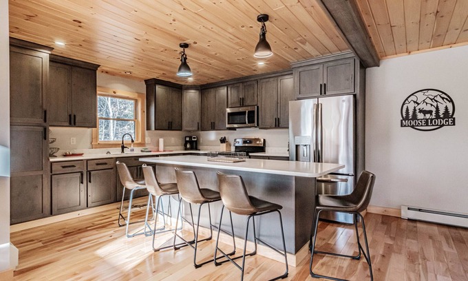 Moose Lodge is a brand-new chalet that can accommodate up to fourteen guests. Just a couple miles to the lifts and with views of the slopes! The lodge offers four plus bedrooms, three and half baths, expansive kitchen with an island. Large dining table to sit and enjoy a meal together. In the Great Room there is a wet bar. You can be the bartender for everyone! In the Great Room there is a gas fireplace which makes a great place to sit and relax after a day on the slopes or out and about. Plus a family room for some TV watching or playing games. Amenities include Two bedrooms that both have king size beds. A master suite with private bath. Two and half baths for everyone else. Hot tub to soak away all of the aches. The damage waiver fee of $150.00 is a non-refundable payment- which covers accidental damage up to the amount of $1500.00. This fee is processed in the overall costs of the rental at the time of booking. The damage waiver fee of $150.00 is a non-refundable payment- which covers accidental damage up to the amount of $1500.00. This fee is processed in the overall costs of the rental at the time of booking. Remember we are in the mountains of Maine and the snow we hope for all year can make travel more difficult. We recommend all or 4 wheel drive in the winter season. The roads and driveway are professionally maintained but guests may find travel difficult without it.