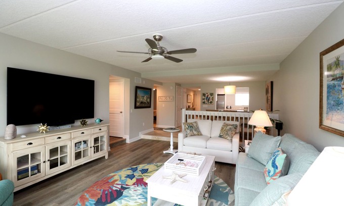 This is a 2 Bedroom 2 Bath Flat. You enter the first floor and no need to worry about stairs. This condo sleeps 6 and has all new bedding with a King in the master, 2 twins in guest room and a sleep sofa in the living room. There a re 3 TV's with a brand new 75" in the living room. All new furniture and tile flooring throughout. At Summerhouse we have 4 temperature regulated pools, making it comfortable to swim all year round. There are 4 tennis courts, 2 racquetball courts and a pickleball court. We have 2 grilling areas and 2 playgrounds for the kids. They are conveniently located at either end of the property. Each phase has it's own pool and walkover to the beach. We have a friendly front office staff and on site maintenance to help resolve problems quickly.