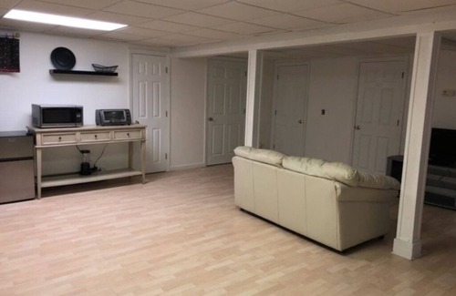 Bedroom 5/ basement: Walkout basement (efficiency apartment), with two full-size beds (one with a twin trundle), one twin bed, couch, TV and sitting area, mini kitchen (fridge, toaster, microwave with kitchen table) with a full bathroom. This large space features a separate area for your nanny, in-laws or additional living area. The basement also includes a home office with 2 desks with a walk-out sitting area to take your conference calls away from the pool or read a book in this quieter area.