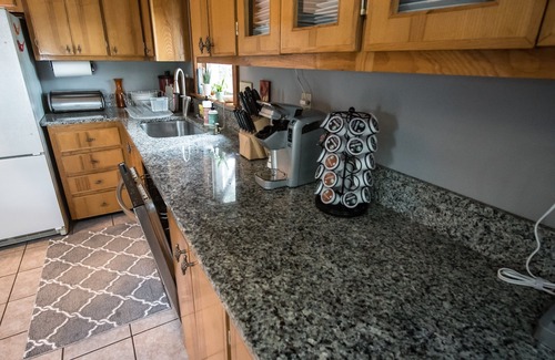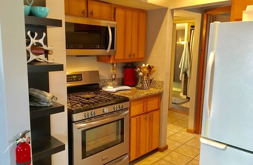 The kitchen features a full gas stove, refrigerator, dishwasher and microwave and is stocked with all the necessary cookware and tableware.