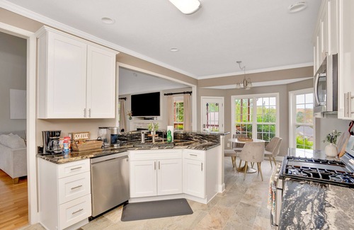 Deck with sunset view, BBQ grill & tools, outdoor dining for 12 & lounge seating. Private fenced yard. Master bedroom laptop-friendly workspace. Formal dining room & breakfast dining nook. KITCHEN: Dishwasher, electric stovetop, double oven, refrigerator, microwave, cooking basics, dishes and serving trays & flatware, drip coffee maker, blender, toaster, spices, trash bags & paper towels GENERAL: Free WiFi, central A/C & heating, ceiling fans, linens & towels, in-unit laundry, hair dryer, hangers FAQ: Stairs required for access to upstairs bedrooms, small dogs may be considered for a pet fee (paid pre-trip), 4 exterior security cameras PARKING: 2 car garage, 2 cars in driveway, no street parking, no parking on grass