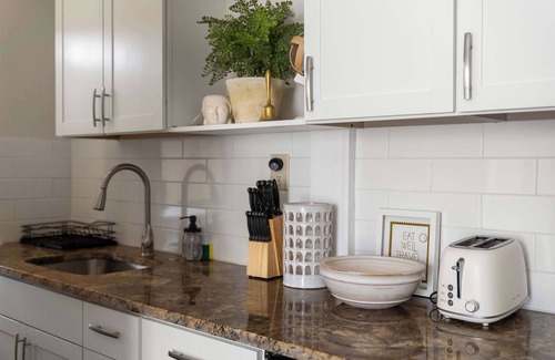 While you're here, you can enjoy all the comforts of home and more, including a refrigerator and an oven, as well as a stovetop and a dishwasher. Other amenities include towels, kitchenware and utensils, a dining area, and a desk.