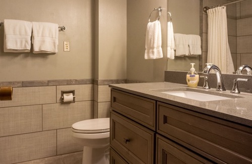 This main lodge studio condo has been updated with granite, wood tile floors, tin ceiling and beautiful bedding. Relax in this tranquil condo of 490 sq feet with excellent views of the red cliffs and pond. 2 queen beds, futon, dining table for 4, 50" flat screen smart TV, smaller 20" flat screen TV to hook up your gaming device, DVD player. Kitchenette has mini fridge, two stove top burner, microwave, toaster, coffee pot, and dishwasher. Sleeps up to 6.