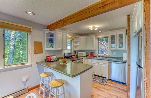 ⭐Fully stocked, modern kitchen w/ island seating + stainless steel appliances