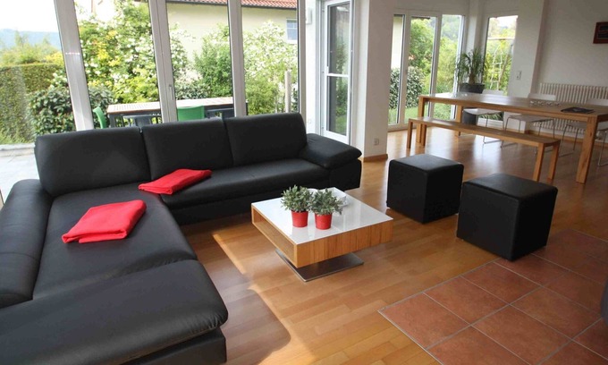 Arrive. To enjoy the silence. Just unpack your bags and then explore the house, the lake, the forests. The Sonnenferien vacation domiciles are inspired by the search for peace, balance, relaxation and a little bit of luxury at a 5-star level. Comfortable living at the lake: The spacious room concept offers space for community and leaves room for individual development and retreat. Freedom for the family, enough space for a vacation with friends. Time to be together, time to withdraw. Generosity and functionality are impressive. The holiday home Sonnenhaus is located at the end of a very quiet cul-de-sac on the outskirts of Ludwigshafen. The house is on a hill and allows views of the surrounding forests and orchards and Lake Constance. The town center, train station, hiking and biking trails, lido and lake promenade are just a few minutes' walk from the Sonnenhaus. The Sonnenhaus has been awarded 5 stars by the German Tourism Association. In Germany the highest possible classification for holiday homes and apartments.