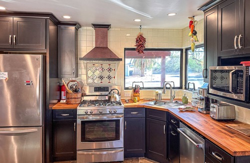 Step into this charming home and be greeted by sun-soaked interiors, artful decor, and ample amenities. A stylish, well-equipped kitchen boasts stainless steel appliances and a large island with additional seating. Enjoy gathering for home-cooked meals or board games at the adjacent dining table. The comfortable living area features plush seating and direct access to your spacious yard. The private pool and well-furnished patio are ideal for lounging poolside with a favorite book, soaking up some sun, and sharing plenty of laughs. After a fun day of excursions, retreat to your cozy bedroom, or unwind with a glass of wine while watching the sunset from your outdoor oasis.