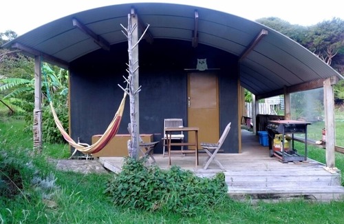 Dome Cabin is sunny and private with 2 bedrooms ,24 volt solar lighting and an outside deck with furniture.