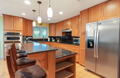 The heart of the home is a stunning, fully equipped high-end kitchen that will delight any chef. Featuring stainless steel appliances, granite countertops, a pot filler, warming oven, and an oversized pantry, it’s perfect for whipping up anything from beachside snacks to full family meals. There’s plenty of room for multiple cooks and conversation around the breakfast bar with seating for 4.