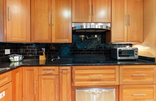 The second bedroom is ideal for families or a group of friends, offering a queen-sized bed plus a bunk bed with a full mattress on the bottom. A stylish full bathroom with a new tiled walk-in shower adjoins this space. A full-sized washer and dryer are also upstairs for your convenience.