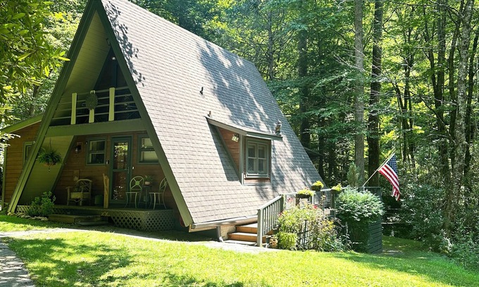 Idyllic mountain A-frame cabin in a gorgeous wooded setting. Guests have access to the full property. The Sunburst Cabin is surrounded 180° by a creek, a babbling waterfall, and a flat back yard with a new Hot Tub! The trees and rhododendrons envelope you, making it feel like you’re staying up in the trees. The covered back deck is a guest favorite, even enjoyable in the rain (maybe even the best time to sit out)!
